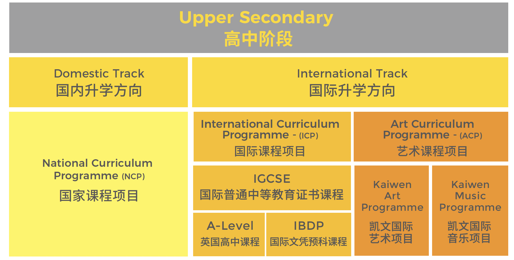 所有初中阶段的学生大多数学科的学习都遵循剑桥国际课程初中阶段的课程标准。按照中国国家课程标准进行教学的学科遵循中国教委所要求的标准,并融合了国际普通中学教育证书课程(IGCSE)、国际文凭课程(IBDP)、大学预备考试等元素,帮助学生在未来进行外部的考试时取得成功。