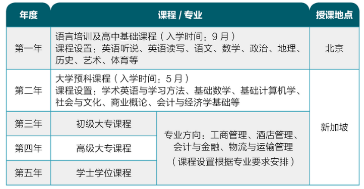 路河国际教育学园获得OTHM 授权为北京分中心,并为该项目学生提供第-年的教学。此后四年的课程由学生在英国伦敦商业金融学院新加坡校区完成第五年的课程由英国格林威治大学提供并为结业者授予学士学位,学位证书受中国教育部承认。