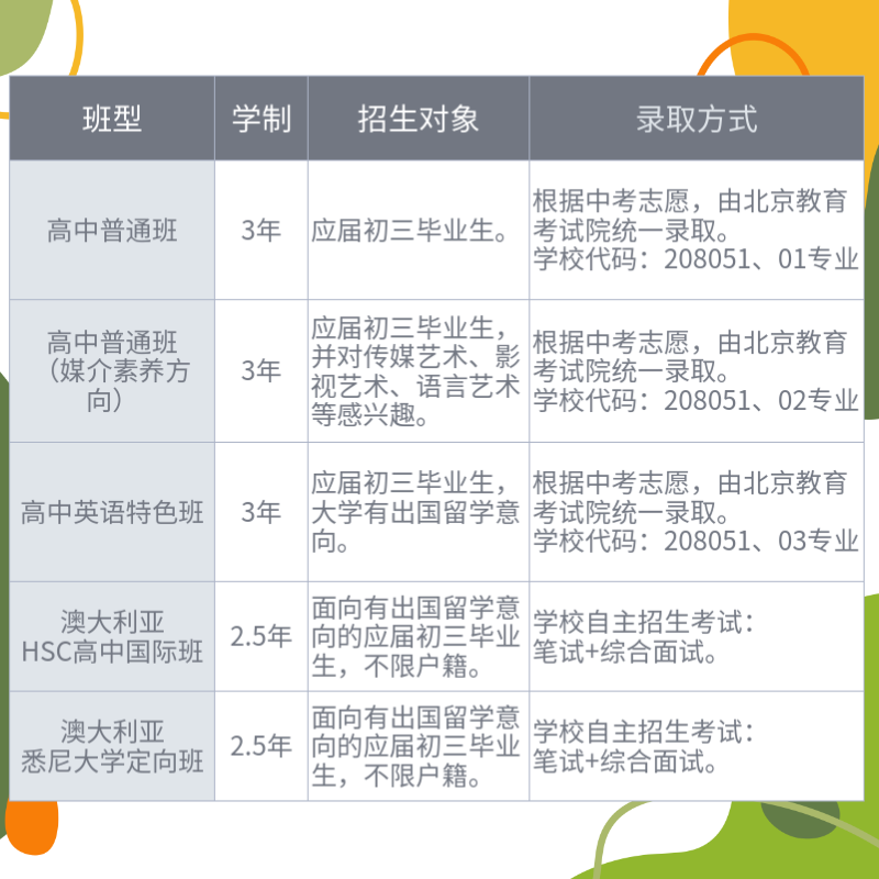 高中普通班、高中普通班(媒介素养方向)、高中英语特色班根据中考志愿,由北京教育考试院按中考成绩统一录取(请注意不同班型专业序号)。
