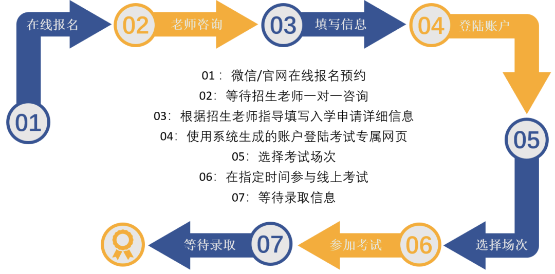 线上:上传标化英语成绩+参加数学在线考试+1v1全英文面试