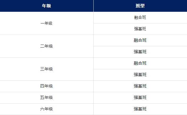 小学部设置了“强基班”与“融合班”两种班型。“强基班”以“国家课程+校本课程”为课程体系,注重学生基础知识的夯实、多元综合能力的培养、广泛兴趣爱好的形成。“融合班”以“国家课程+融合课程”为课程体系,着眼学生华夏根基的立足、国际视野的开拓、领袖能力的培养。