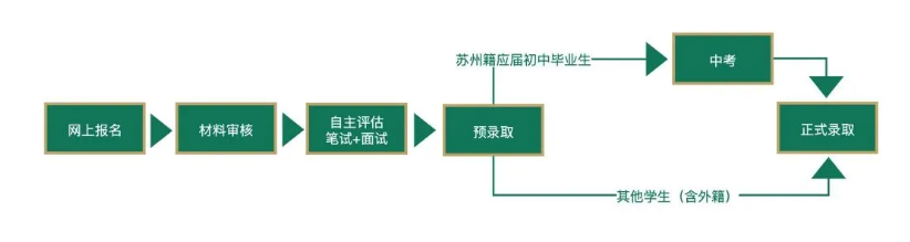 参加学校组织的笔试、面试,获得预录取的苏州籍应届初中毕业生需参加苏州市统一中考并达到苏州中学国际部录取分数线,其他学生(外籍)须完成9年级学业并取得初中毕业证书(或同等学力证明)。由于课程学位有限,采取滚动录取方式,请尽早提交申请。