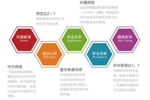 超级完备的课程体系:国际课程方面,橘郡美高海淀课程教学中 心引进美国加州综合排名教高的橘郡安纳 海姆学区蓝带高中课程体系,包含10余个 课程领域的数十门学科,基于兴趣与个体 能力满足不同学生的学习需要,学校还提 供了包含物理、化学、生物、历史、经济、 微积分、统计学等一系列的美国大学理事 会AP课程。学生可提前学习美国大学先 修课程,成绩合格便可修得未来美国大学的学分,节省留学时间与留学费用; 此外、橘郡美高海淀课程教学中心开设SAT/TOEFL标准化考试国际课程,学 生无需额外缴费,便可告别为了考试而 游走在各个培训机构的日子。毕业可获美国高中文凭 学生经过学习,成绩达到毕业标准的学 生可获得美国加州教育局颁发的毕业证 书,获得美国高中文凭。