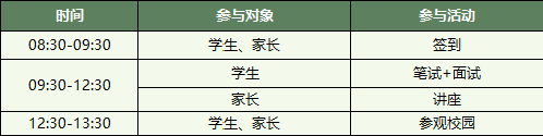考试时间:2025年10月25日周六招生对象:G9-G10在读学生课程设置:A-level、AP、日本EJU项目考试科目:数学、英语、面试开放日安排:8:30-9:30 学生&家长签到9:30-12:30 学生笔试+面