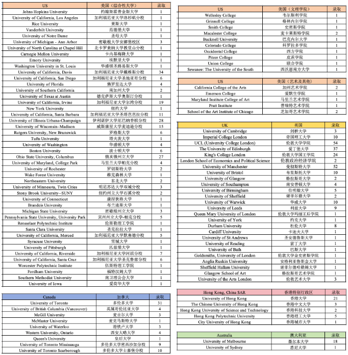 美国方向95%的学生成功收获了美国US NEWS排名前50的大学录取,其中65%的学生被US NEWS排名前30的综合性大学所青睐。