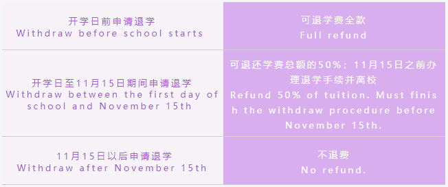 所有的退学必须在下表标明的截止日期之前向中学部主任(wkliu@this.edu.cn)或小学部主任(rrudisaile@this.edu.cn)提交正式书面申请,得到学校批准后,按照学校退学转单找相关老师进行手续办理才能得到相应的退费和成绩单。请家长仔细阅读入学须知的内容,并严格遵守协议内容。