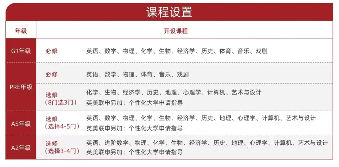 除此之外,学生根据自身情况在以下7门科目中自选2门选修科目作为主课,为将来A-Level课程学习打好基础。