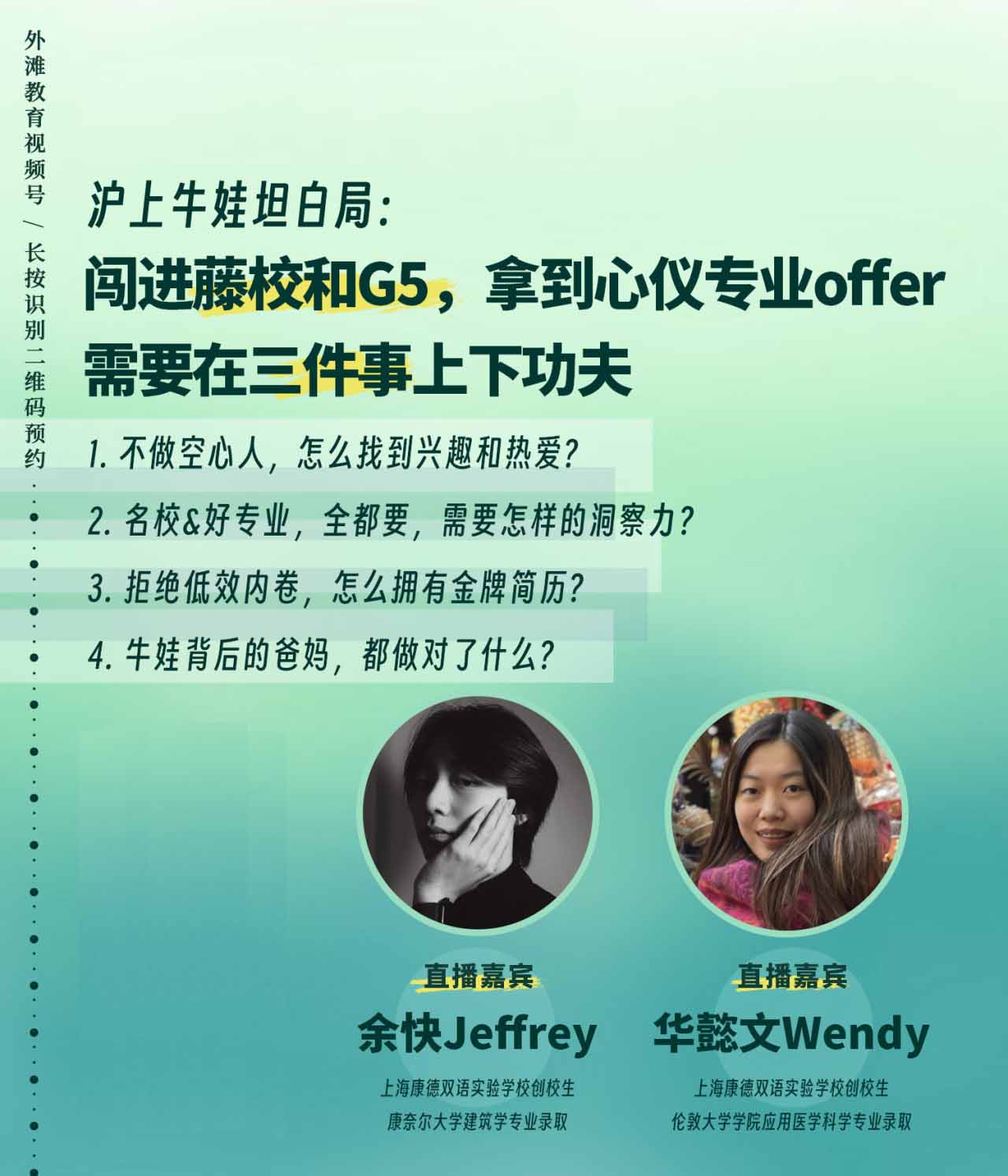 上海康德双语实验学校(以下简称:康德双语)将于1月30日(明日)晚八点举办一场线上直播活动,特邀外滩教育以及我校已被康奈尔大学建筑学专业录取的Jeffery YU同学和已被伦敦大学学院应用医学专业录取的Wendy HUA同学分享升学心得。