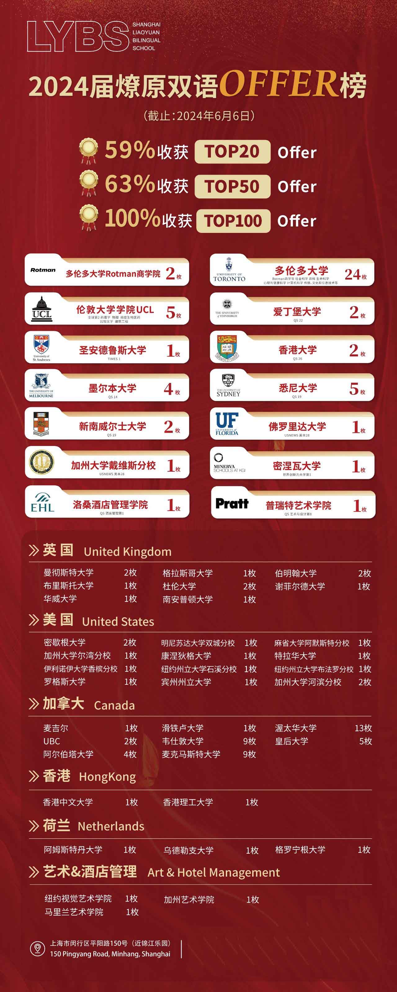 截至目前,2024燎原高中国际课程班四大课程项目(DP+AL+OSSD+美高) 59%的毕业生录取全球Top20院校,63%的毕业生录取全球Top50院校,100%毕业生获得全球Top100大学录取。
