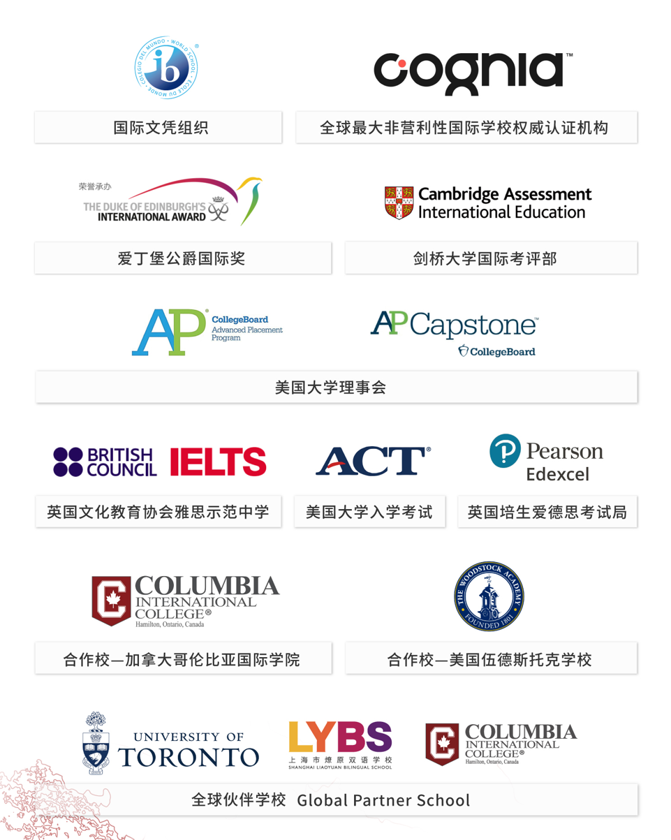 作为上海最早获得教育局批复开设加拿大高中OSSD项目的学校,燎原双语LYBS拥有Cognia认证、国际文凭组织IBO、牛津AQA考试局、CAIE剑桥大学国际考评部、培生爱德思考试局、美国大学理事会、英国爱丁堡公爵国际奖、英国文化协会雅思示范中学、ACT、小托福考试授权考点等战略合作和授权认证;与加拿大哥伦比亚国际学院(CIC)、美国百年名校伍德斯托克学校合作办学多年,是加拿大多伦多大学的全球伙伴学校。