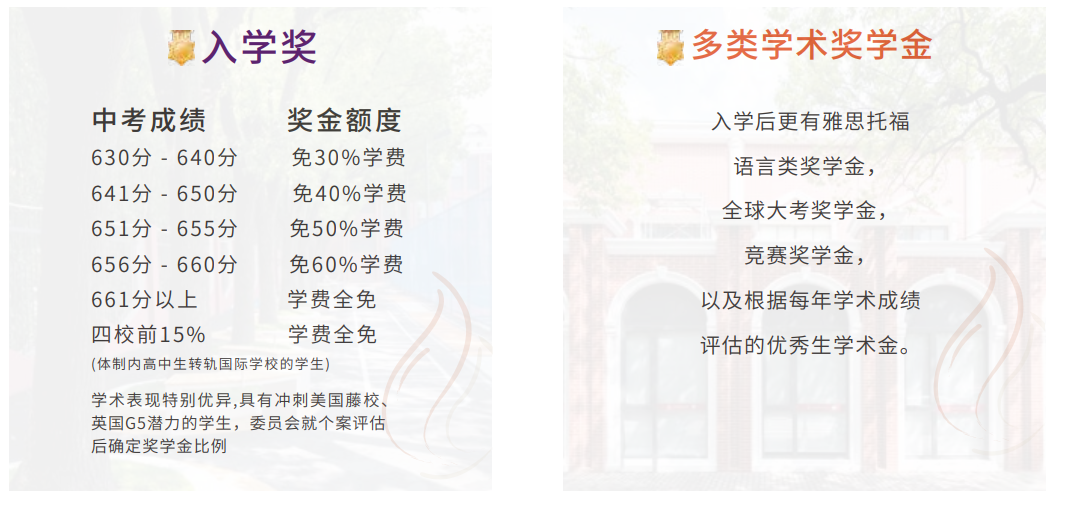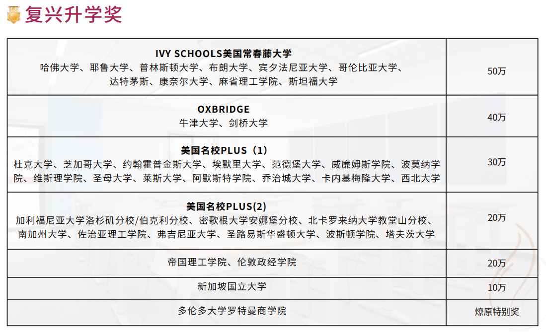 入学奖、学术奖最高可学费全免,复兴升学奖百万奖金助力学子冲击牛剑藤校,录取多伦多大学罗特曼商学院可获燎原特别奖,另有竞赛、进步、语言、全球大考等单项奖金,全方位激励燎原学子不断进取,获得成就。