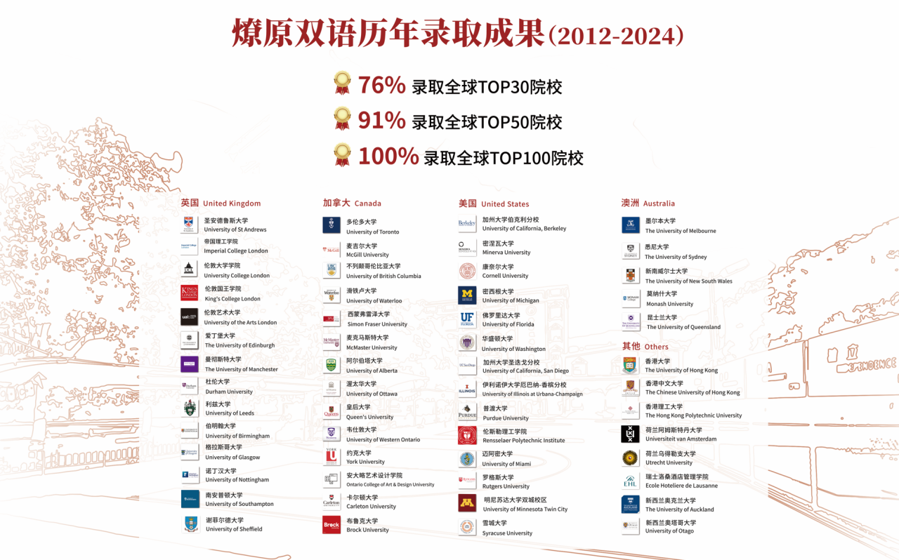 燎原高中国际课程班历届毕业生,76%录取世界前30大学,91%录取世界前50大学,100%录取世界前100大学。