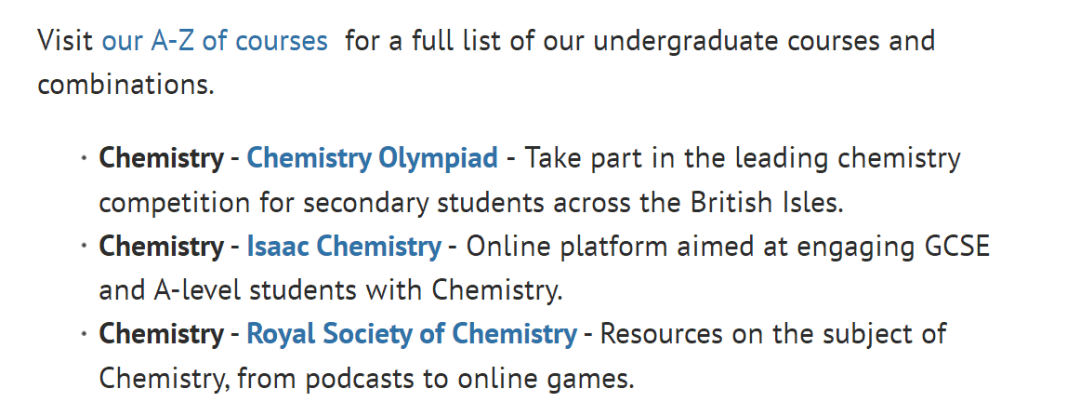 在牛津大学推荐的“学术活动表”中,针对化学学科,特别强调和推荐了UKCHO竞赛,帮助学生挖掘兴趣培养能力。