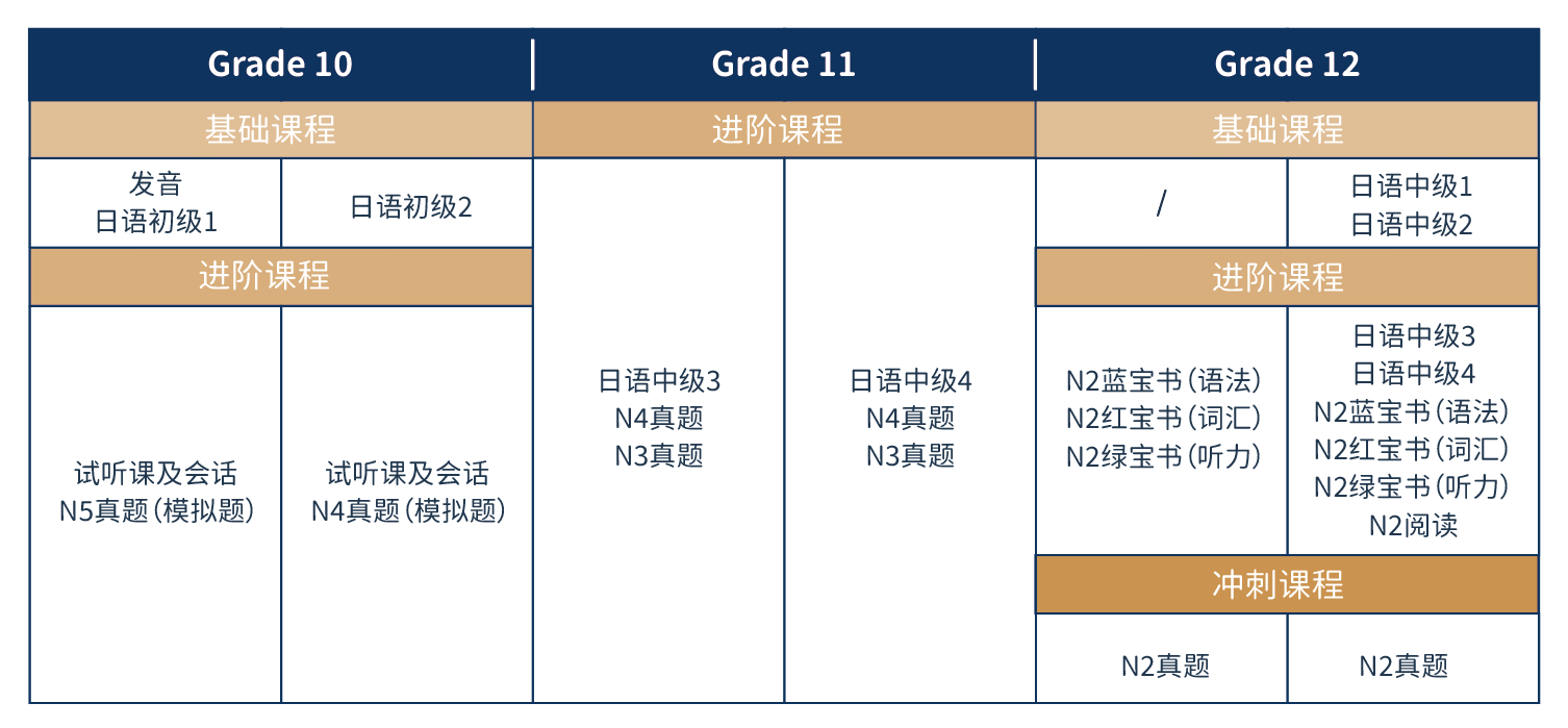 在AP和A-Level的基础课程之外,为帮助选择日本方向留学的学生未来更好地融入日本大学生活,学校在社团时间开设日语课程,使有日语学习需要和对日语感兴趣的同学可以在校内接受专业日语老师的授课和辅导。