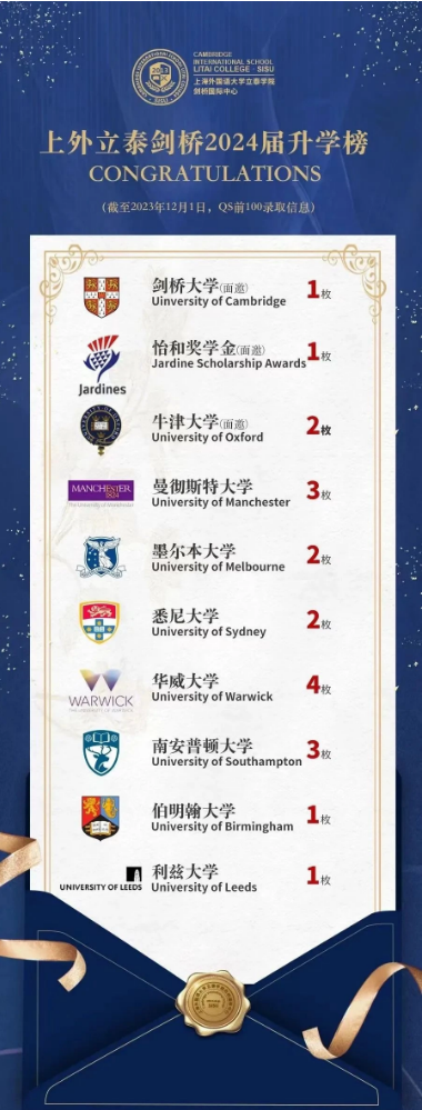 2024届是上剑第八届毕业生,在同学、老师和家长的倾力配合下,海外名校录取有着突破性的进展:其中包括牛津大学面试2封,剑桥大学面试1封,剑桥大学怡和奖学金面试1封等卓越成果。目前已有1位学生获得牛津大学St Hugh's 学院(电气工程专业)录取。