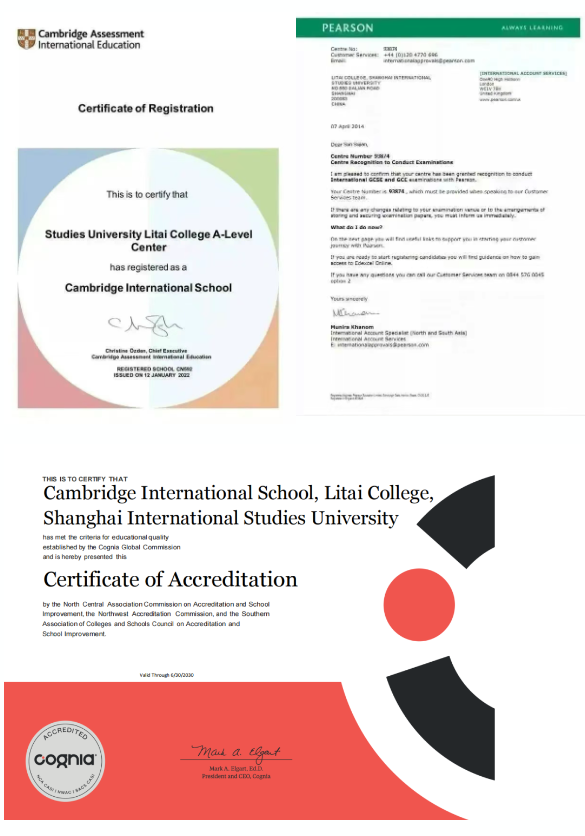 作为上海首批获得英国双考试局认证的学校之一,上外立泰剑桥不仅拥有剑桥国际考评委员会CAIE(考试局编号:CN592)和爱德思考试局Edexcel(考试局编号:93874)的双授权。还在2023年获得了世界先进教育组织(Cognia)的认证。Cognia认证是世界最大的国际学校认证机构,它也是由美国国家教育部认证(National Association of Competitive Consultants)的三大国际学生组织之一。