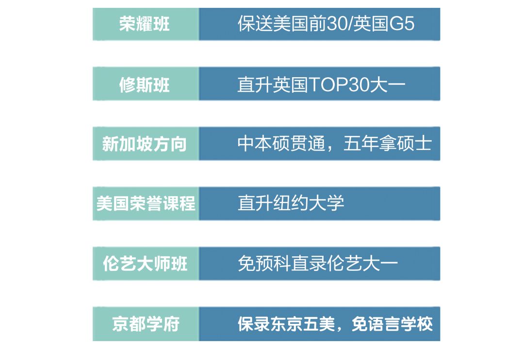 荣耀班为冲刺牛剑藤校设立,由学术校长带班,各学科学神主任带课,藤校教授亲临指导专业课题,哈佛大学创新课教授助力背提,顶尖赛事导师指导参加世界级竞赛。