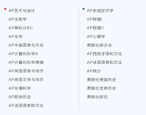 所有AP课程都有先修课程,大部分课程都需要入学考试。分班是根据学生表现超出常规课程平均水平的能力来决定的。