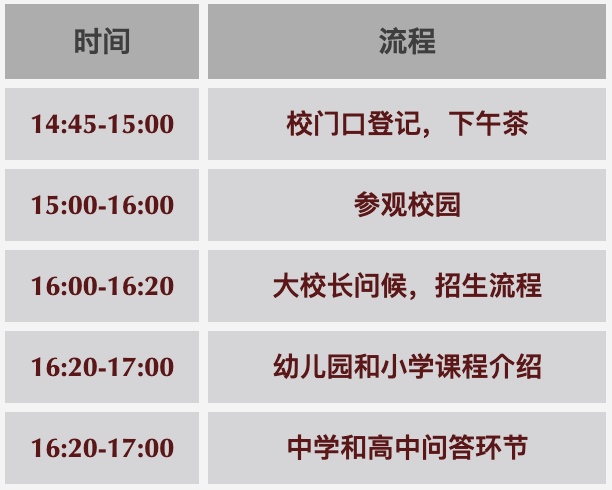 此次校园开放日是家长全方位了解学校环境,与学校教职员工会面,探索学校课程体系的好机会。开放日的当天,各学段的校长将会分享相应负责学段的教学课程体系,也会为提供Q&A时间,为家长答疑解惑。
