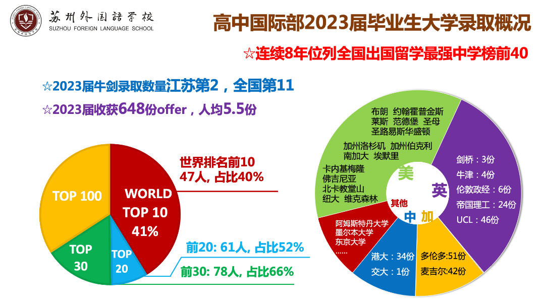 在2023年申请季中,苏州外国语高中部共拿到了648枚offer,人均5.5枚offer可还行?