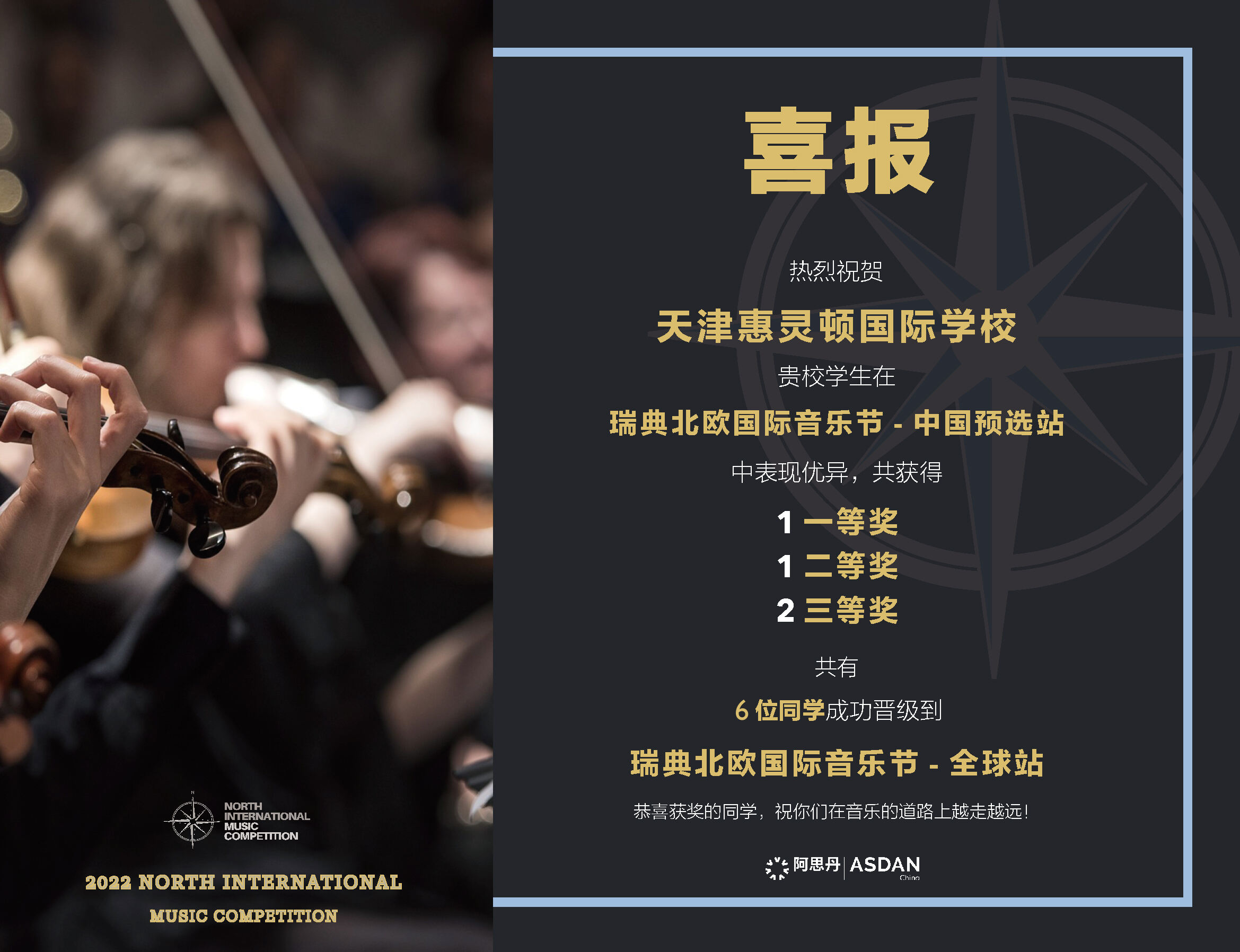 本学期,惠灵顿天津校区的六位学子代表学校参加了瑞典北欧国际音乐节 - 中国预选赛。六名年轻的音乐家都分别获得了奖项,并且全部获得了参加全球站比赛的资格,他们将与世界各地的音乐家们同台竞技,也为这个学期画上了一个圆满的句号。