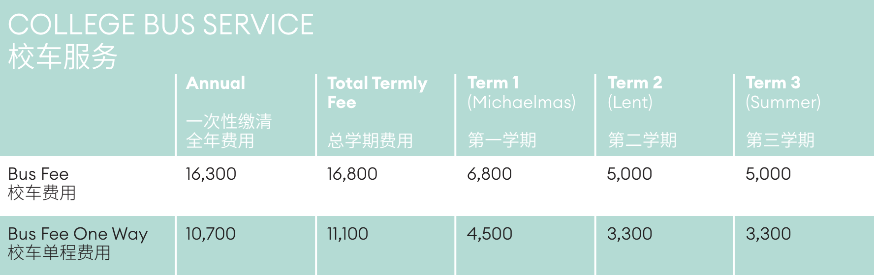 • 学费不包括学生在校的午餐、校服、校车服务和个人学习乐器所需的费用。