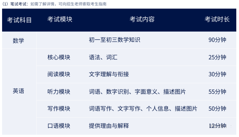 学校将根据学生入学测试的笔试(英语及数学)成绩和面试测评,给予符合条件的学生录取资格。