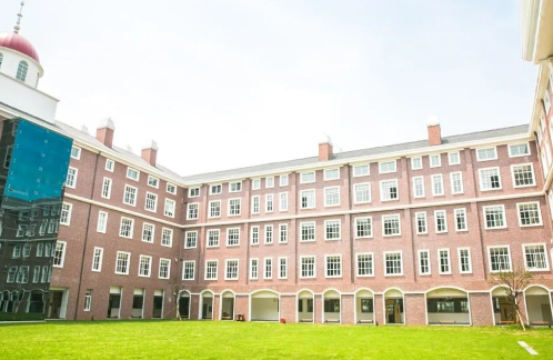 回廊式教学楼,中央空地还给绿色草坪,营造出充满自然美的宁静校园环境。
