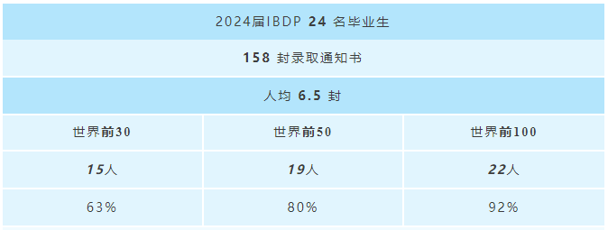 截至目前,无锡市协和双语学校2024届IBDP毕业生共收获158封全球一流大学的录取通知书。其中63%的学生收获世界前30的大学录取,80%的学生收获世界前50的大学录取,92%的学生收获世