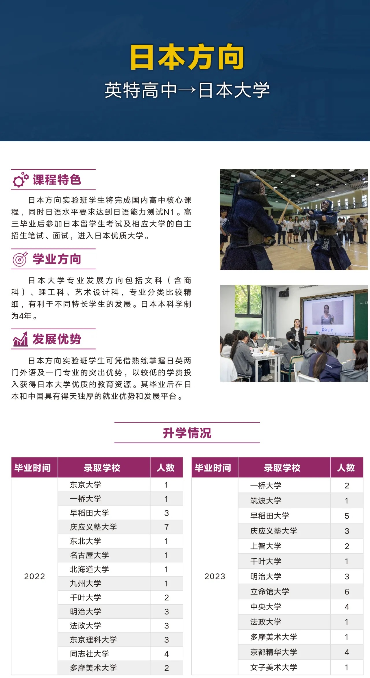 实验班将完成国内高中核心课程,同时日语水平要求达到日语能力测试N1。高三毕业后参加日本留学生考试及相应大学的自主招生笔试、面试,进入日本优质大学。