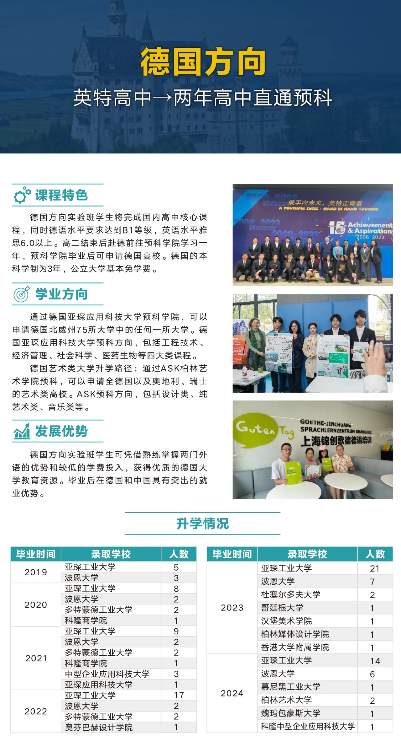英特高中双语部的课程设置基于个性化教育的理念,为学生扬长避短地选择不同专业方向和学科体系创造了优越的条件。目前高中双语部设有四个不同方向,四大专业课程体系,三种不同语言构成的多元的大学升学路径,包括英美(A-Level),德国(预科)、澳洲(预科)、日本(留考)等方向的留学路径,以及工科、商科、文科、设计科等四大类留学预备课程体系,以及相应的英语、德语、日语等三种第一外语的学习课程。