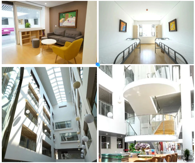 进入宿舍楼,宽阔明亮的走廊顺着视野延伸开来,落地窗、学习区、休息区、旋转楼梯……
