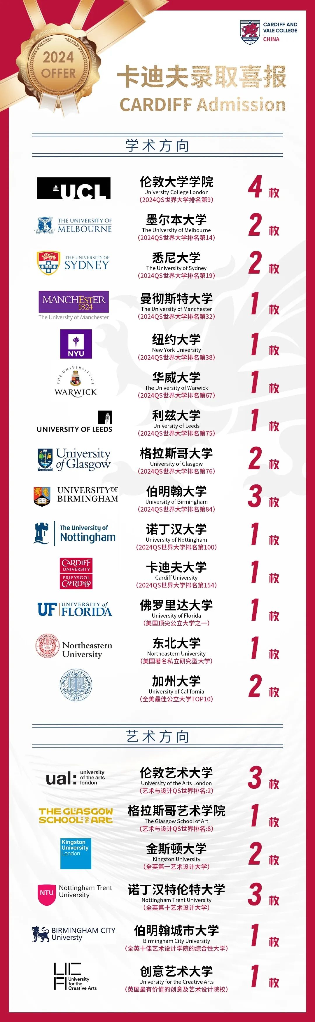 常州卡迪夫2024届准毕业生们同样也取得了喜人的成绩,每位同学都收到了多封来自世界名校的offer。