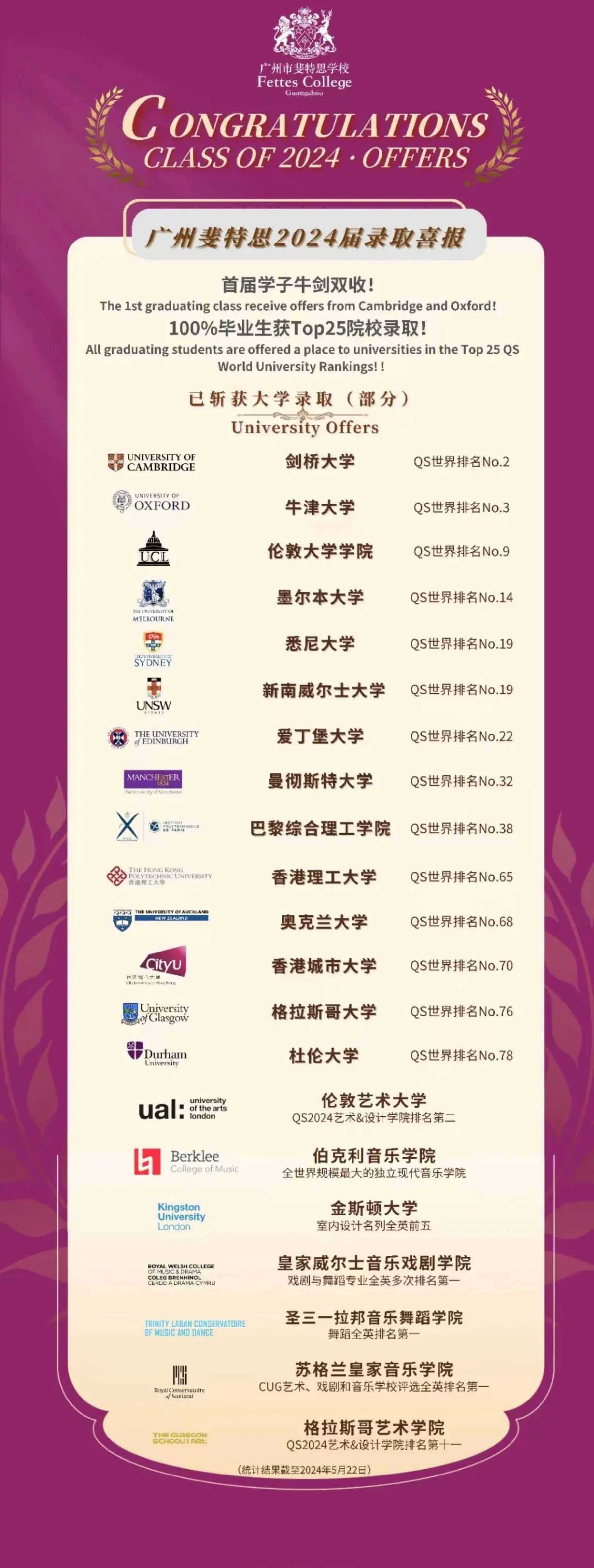 斐特思首届5名毕业生,1人拿下牛津,1人拿下剑桥,毕业生100%揽获QS排名Top25的高校offer。