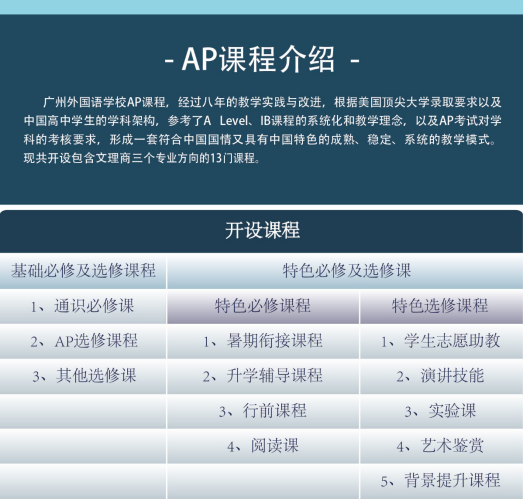广州外国语学校AP&AL国际课程始建于2009年,依托广州外国语学校深厚的历史底蕴及强大的办学实力,经过15年的耕耘,发展出了基于中国教育国际化的“差异创新”育人理念。广州外国