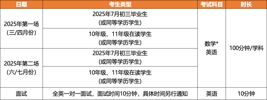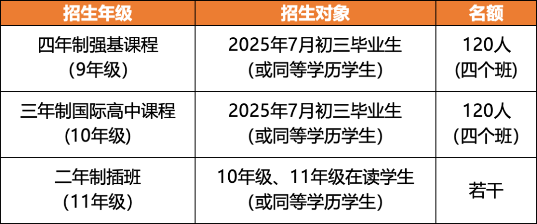 三年制及四年制课程,欢迎志存高远的优秀初三学生及同等学历的学生(如:国际课程体系IGCSE课程G1, IB课程Pre-DP1,海外高中9年级学生等)积极报考;学籍、户籍不限;