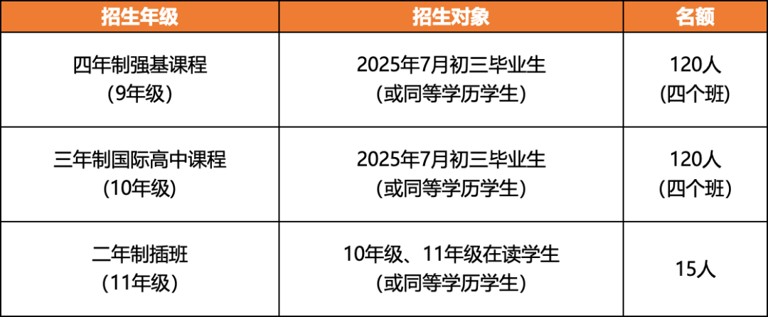 三年制及四年制课程,欢迎志存高远的优秀初三学生及同等学历的学生(如:国际课程体系IGCSE课程G1, IB课程Pre-DP1,海外高中9年级学生等)积极报考;
