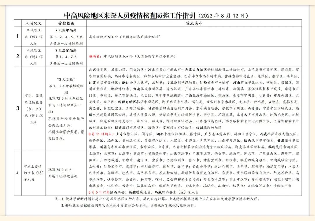 根据《深圳市新冠肺炎疫情防控指挥部办公室校园疫情防控工作专班关于做好2022年暑假期间校园疫情防控工作的通知》要求,所有学生在开学前提前10天返回深圳(即8月18日前),开展健康监测及相关核酸检测要求。学生及家长返深后按照我市《中高风险地区来深人员疫情核查防控工作指引》(圈层图)落实防疫要求。